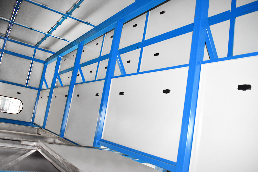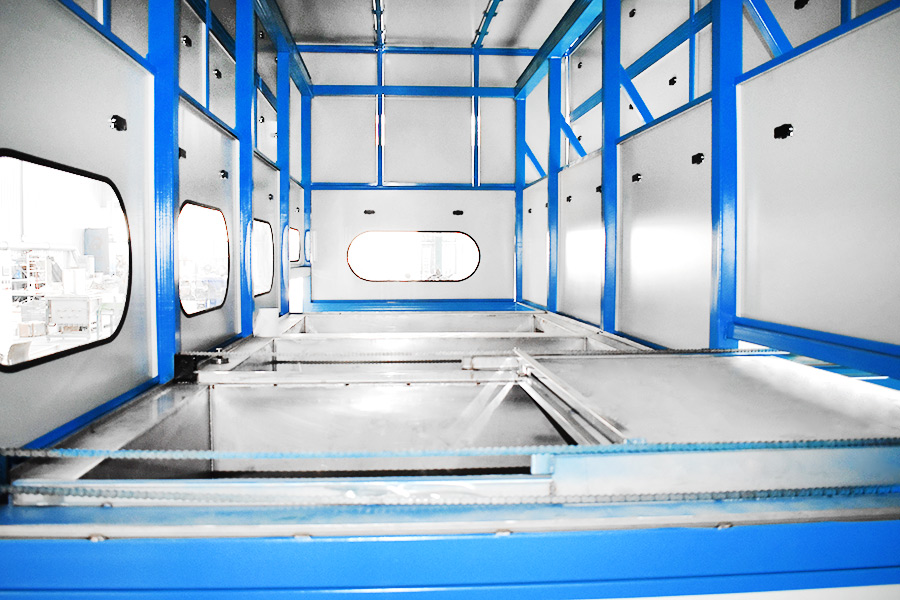 該設備有自動上下料及轉角系統、超聲波清洗系統,自動拋動、自動溢流和油污分離裝置,噴淋系統、自動高壓切水系統、自動烘干系統。機械手自動輸送系統采用高精度直線導軌配合高精度位置檢測傳感器,機械手可以準確的實現工件的抓取和放置。自動進排液和自動加溫系統完全實現了無人干預,自動運行,很大程度上降低了工人的勞動強度。先進的霧氣處理系統可以將清洗時產生的霧氣冷凝回流,空氣經過濾和活性炭吸附后排出。