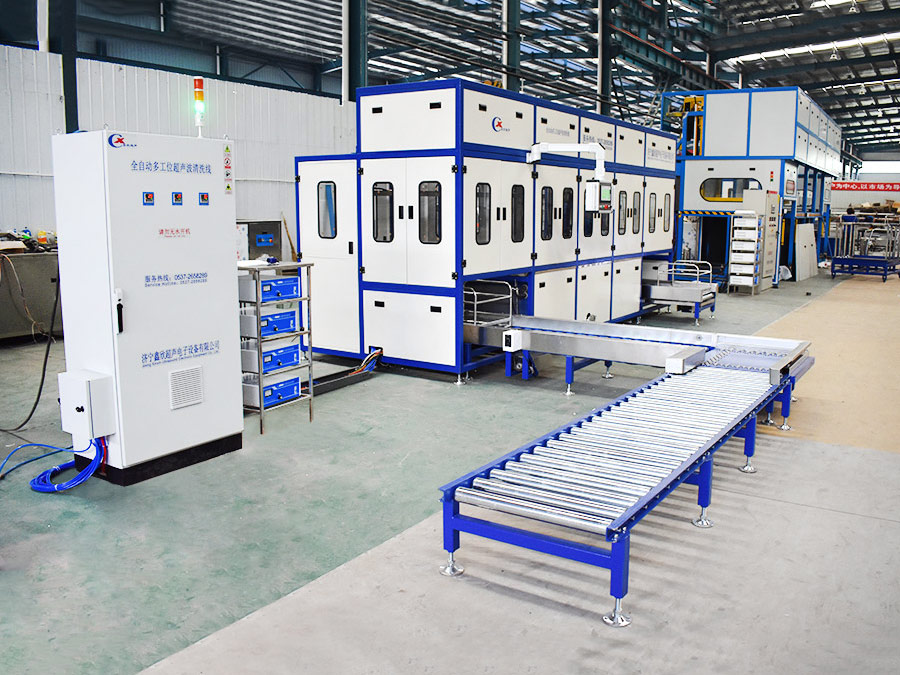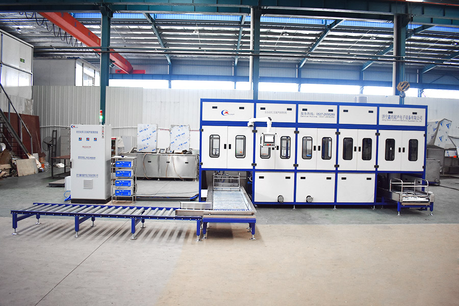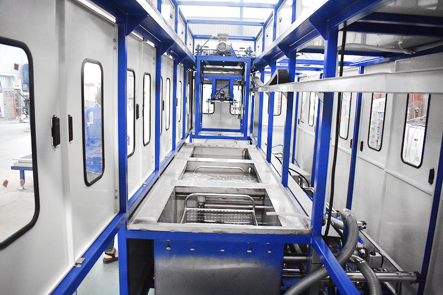 該設(shè)備有自動上下料及轉(zhuǎn)角系統(tǒng)、超聲波清洗系統(tǒng),自動拋動、自動溢流和油污分離裝置,噴淋系統(tǒng)、自動高壓切水系統(tǒng)、自動烘干系統(tǒng)。機械手自動輸送系統(tǒng)采用高精度直線導(dǎo)軌配合高精度位置檢測傳感器,機械手可以準確的實現(xiàn)工件的抓取和放置。自動進排液和自動加溫系統(tǒng)完全實現(xiàn)了無人干預(yù),自動運行,很大程度上降低了工人的勞動強度。先進的霧氣處理系統(tǒng)可以將清洗時產(chǎn)生的霧氣冷凝回流,空氣經(jīng)過濾和活性炭吸附后排出。