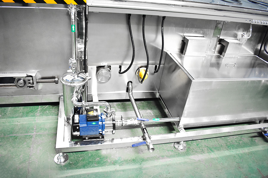 該設備有上下料網帶、超聲波清洗工位、噴淋漂洗工位、高壓風切、熱風烘干工位、溫控水加熱系統、風機、溫控空氣加熱系統、移動式風刀、PLC+觸摸屏控制系統、管路系統及智能電器控制系統等組成。自動進排液和自動加溫系統完全實現了無人干預,自動運行,很大程度上降低了工人的勞動強度。先進的霧氣處理系統可以將清洗時產生的霧氣冷凝回流,空氣經過濾和活性炭吸附后排出。